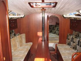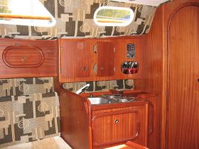 pełne wyposażenie kambuza: kuchenka gazowa, zlewozmywak, butla turystyczna z gazem, zastawa stołowa, sztućce, garnki nierdzewne, patelnia, czajnik, deska do krojenia, durszlak, kanistry na wodę