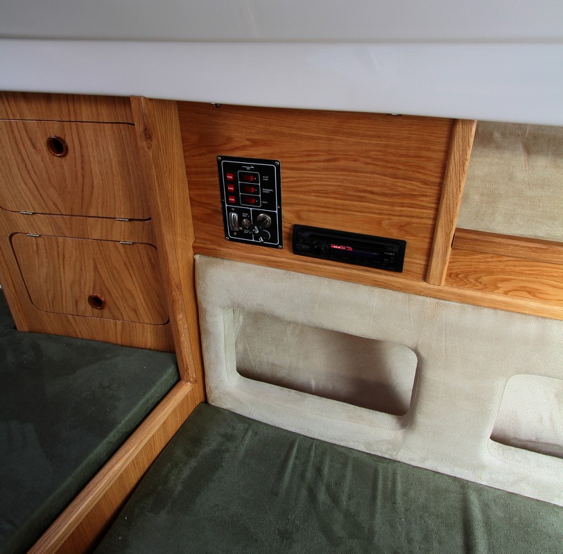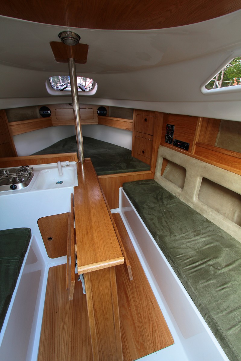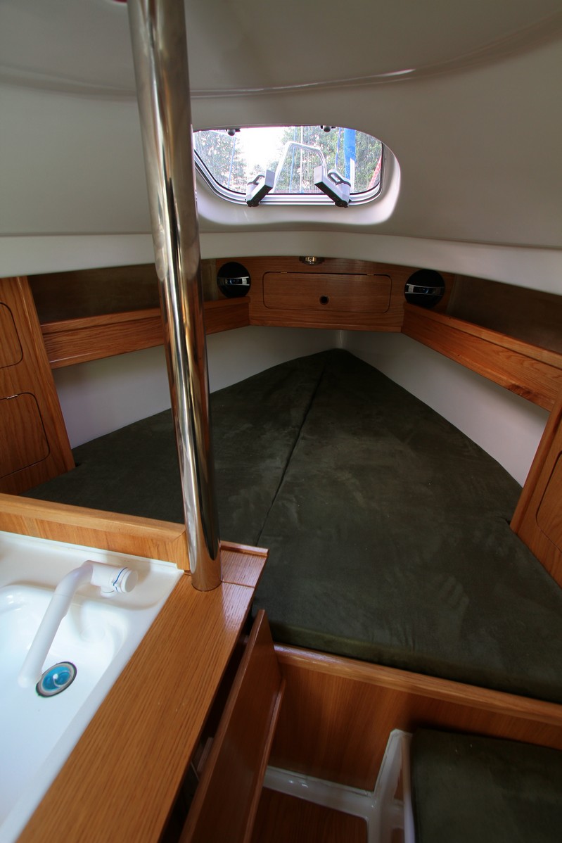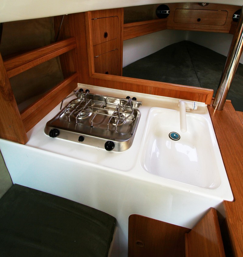 pełne wyposażenie kambuza: kuchenka gazowa, zlewozmywak, butla turystyczna z gazem, zastawa stołowa, sztcce, garnki,patelnia, czajnik,deska do krojenia, durszlak,